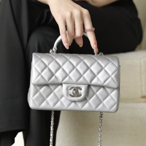 • 샤넬 클래식 캐비어 뉴미니 탑핸들 실버 20cm